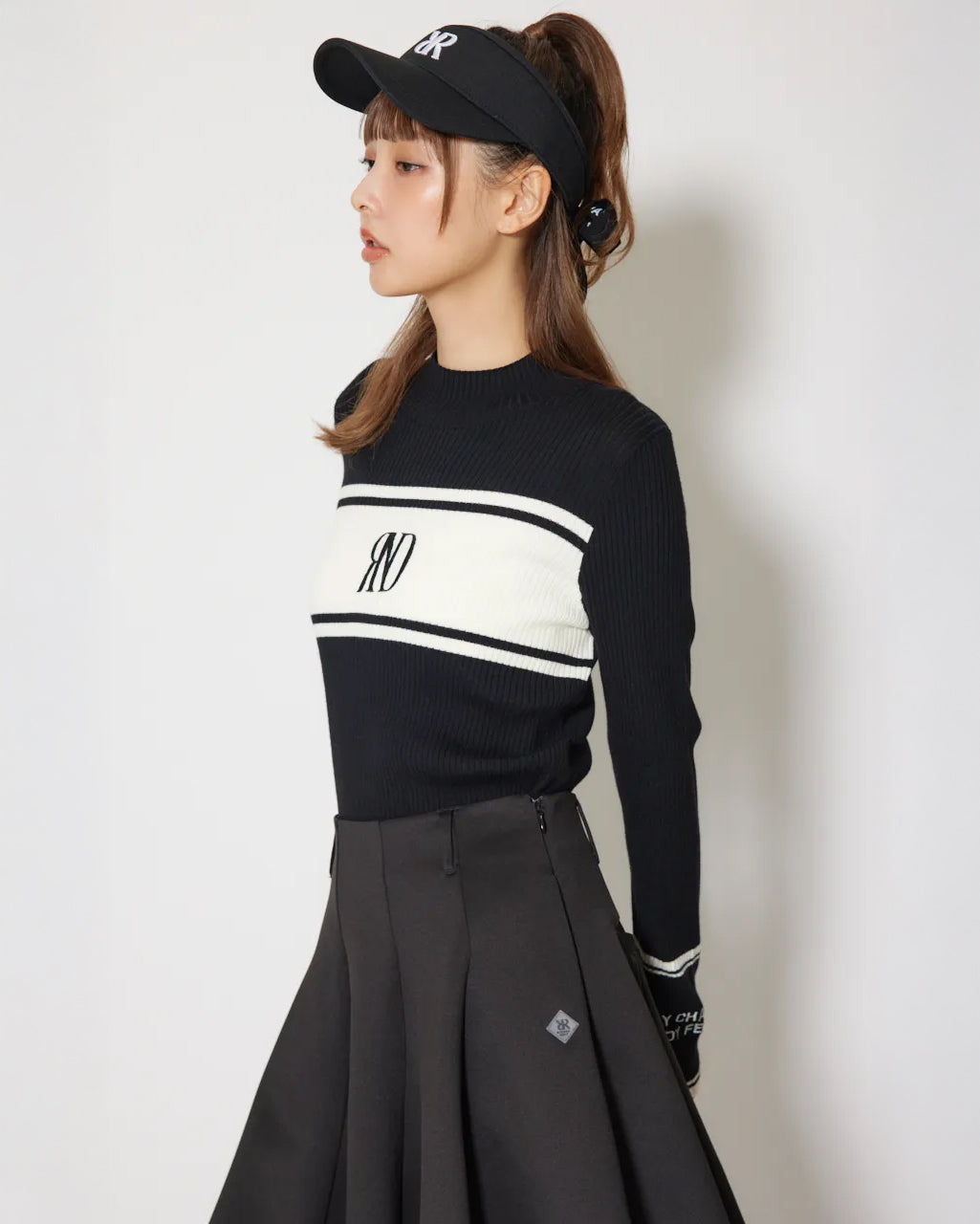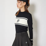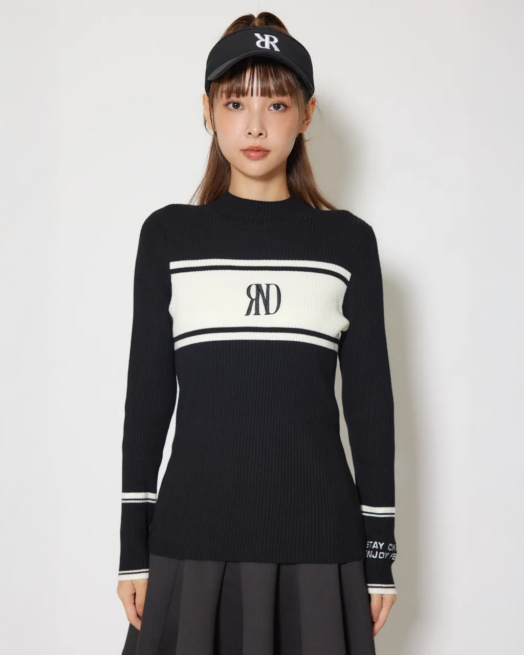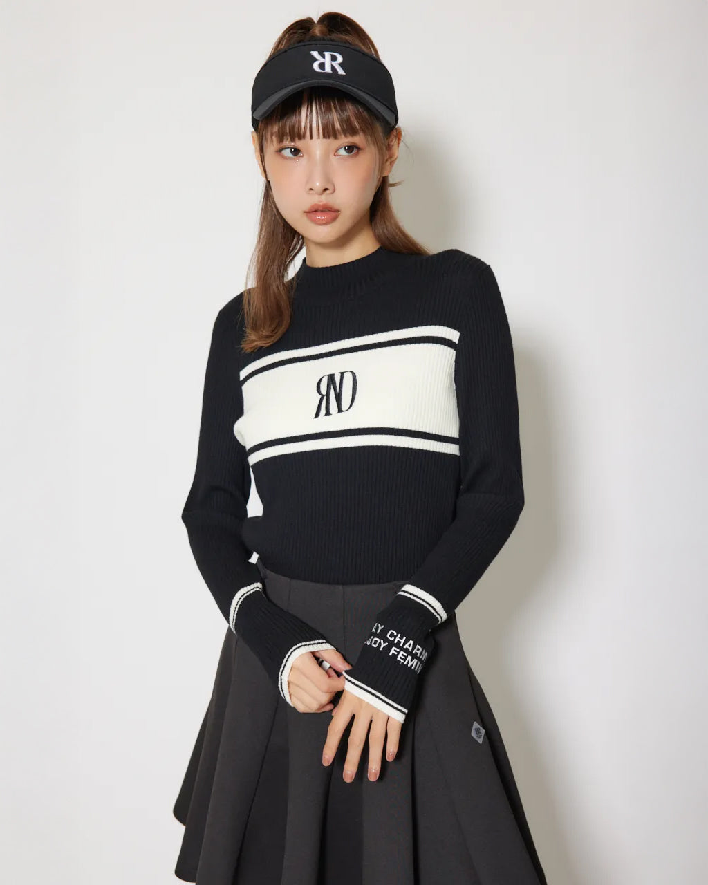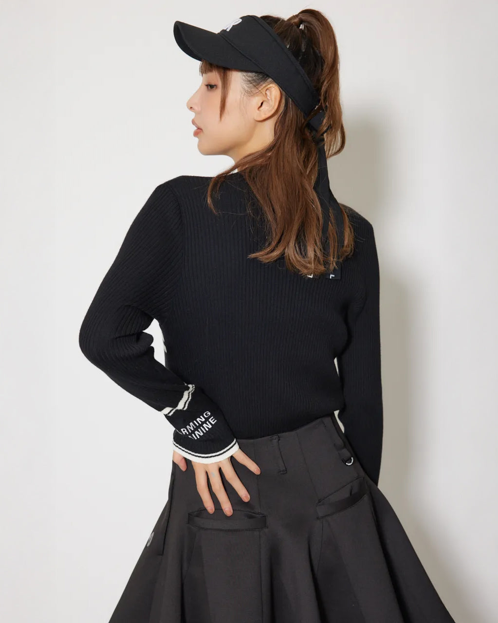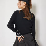 ハイネックなので、首元も暖かく着用できます。フロントのロゴは大きすぎずないサイズ感なので、ボトムスに無地・柄どちらがきても着合わせしやすいです。また、刺繍でデザインにすることで立体感を出し、華やかさも演出。袖口にラインディテールを入れることで、手首がシャープに華奢見えするデザインにしています。