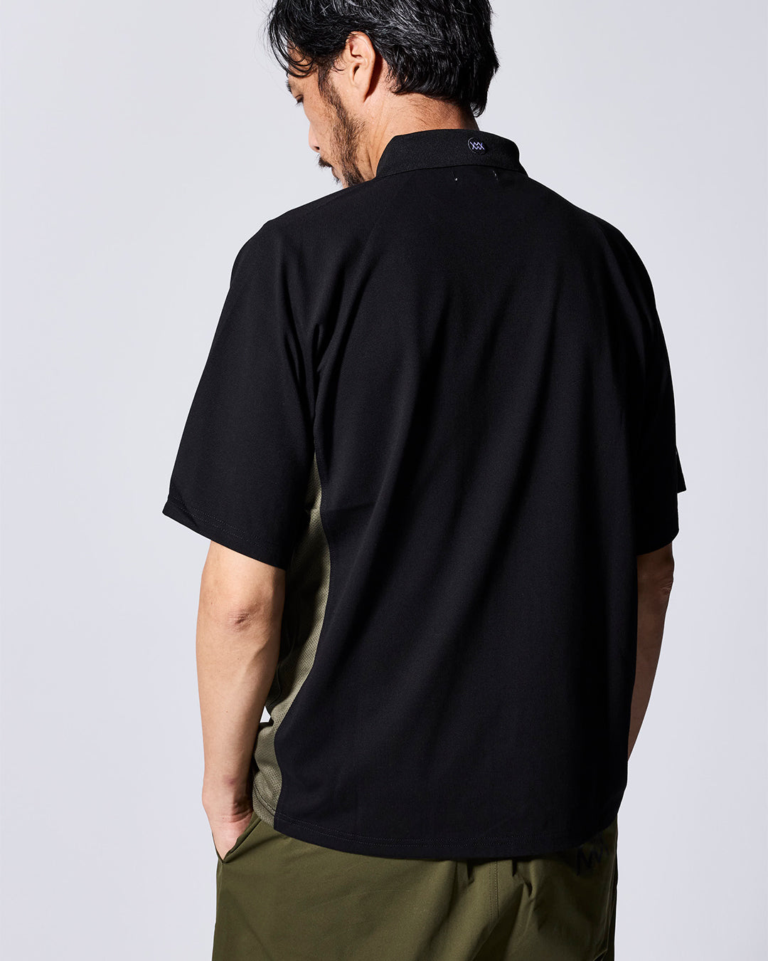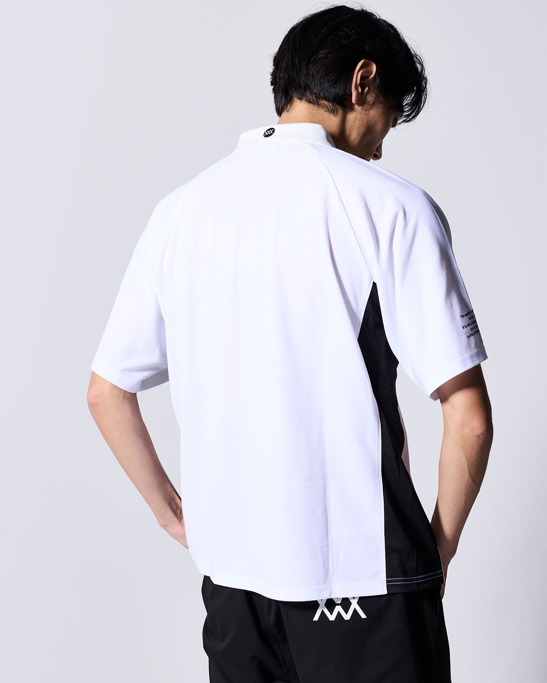 接触冷感素材、両サイドと脇にメッシュ素材を使用し、襟後ろの首が当たる部分の通気性も確保した暑い時期に最適な一枚。